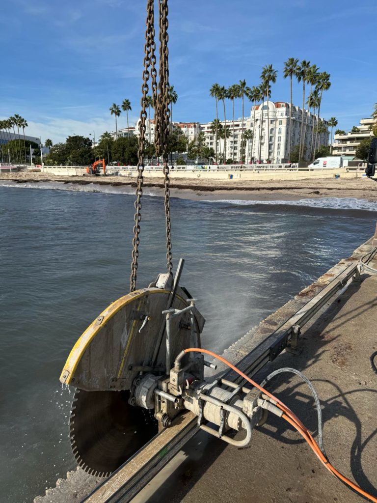 Intervention pour la découpe de 43 voiles préfa servant d’enveloppe au droit d’un ponton sur notre magnifique ville de Cannes.